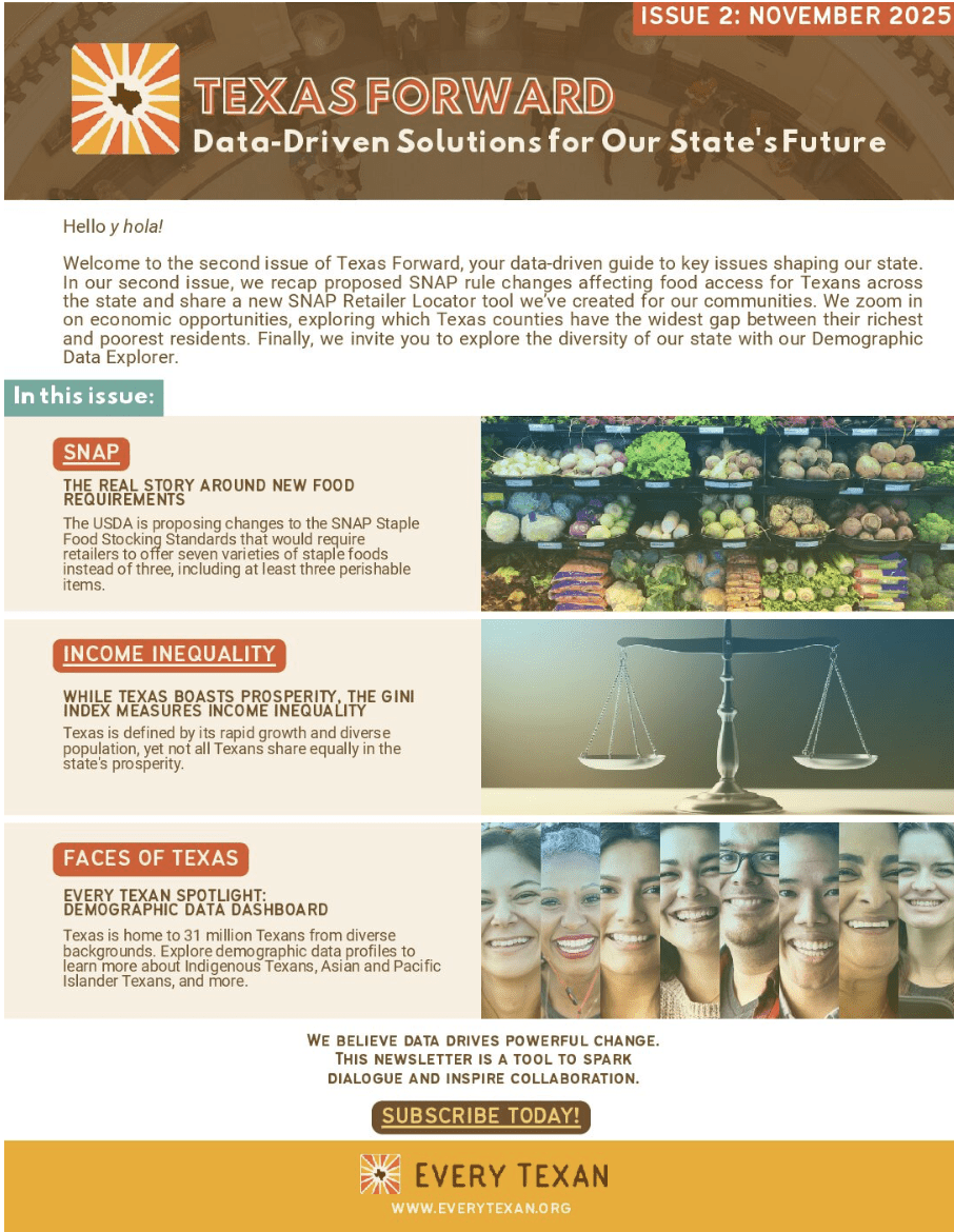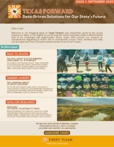 Do you represent a community foundation, service provider, or other entity looking to use data to inform your work? Partner with the policy experts at Every Texan to benefit from our rigorous data analysis, advocacy, and communication services. We are available for hire for contract or grant-funded projects that will help you make informed decisions.